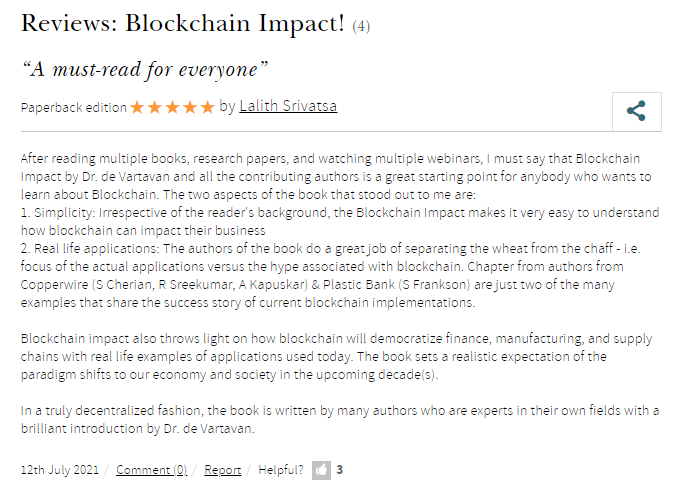 The answer to this question, and a specific use case of blockchain technology, i.e. publishing, is revealed in the book. It explains how Blockchain Impact! puts into action some of the suggestions to protect authors made in the UK Parliament by its consultant editor, Dr Christian de Vartavan FLS FRSA. However, this is just one of many such questions Blockchain Impact! answers, and one of several practical and fully functional use cases of blockchain that the book showcases. Seventeen senior company executives (mostly CEOs) and leaders in their fields, some former or current university scholars, belonging to 15 companies from around the world ranging from Daimler (Germany) to the NHS (UK) via Plastic Bank (Canada) and Copperwire Systems (USA), show how they have implemented blockchain with success in their own businesses.